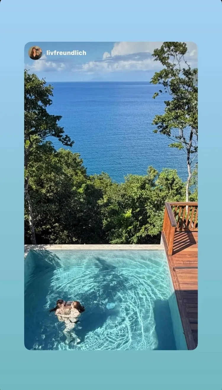 Фотографија, објављена преко Instagram Stories, забележила је Мур и 23-годишњу Лив у опуштеном загрљају током купања поред базена. Снимљено одозгоре, сцена је делује готово филмски: базен у инфинити стилу, дрвена тераса, отворена вода и бујно зеленило које се пружа у даљину. Смирено, интимно и без напора шик.