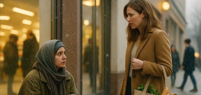 Stajala je ispred ulaza u supermarket, umotana u maramu izbledelu do boje magle.Vetar joj je iz ruku čupao plastičnu čašu, šuštao kesom, nosio prašinu po trotoaru.Žena je prolazila