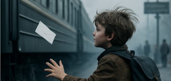 Voz je već kretao. Zveckanje točkova mešalo se sa zviždukom, u vazduhu miris gvožđa i uglja. Na peronu stoji dečak, desetak godina, u pohabanom kaputu, sa rancem i