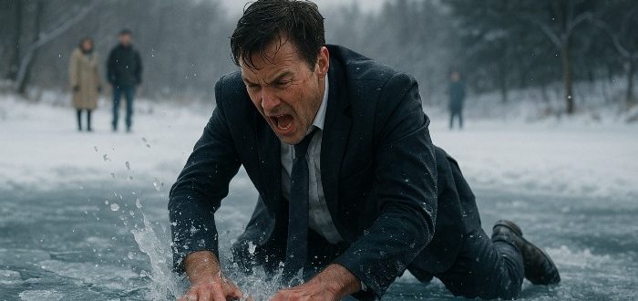 Jezero je stajalo mirno, sivo kao ogledalo. Mraz je bio takav da se dah pretvarao u paru već na izdahu. Ljudi su šetali obalom — neki su hranili