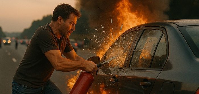 Vozio je autoputem između gradova. Prazan put, večernje sunce u retrovizoru. Radio tiho svira, vazduh miriše na benzin i proleće. Sve mirno — dok se napred nije pojavio