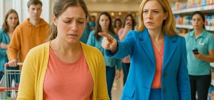 Prodavnica je zujala kao košnica.Subotnji dan, prepune police, kolica se sudaraju u prolazima, miris hleba i kafe meša se sa dečjim smehom.Red na kasi — dug, neko nervozno