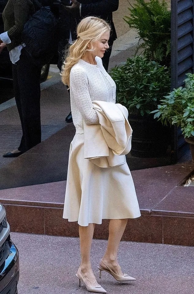 Tokom snimanja, Kidman se pojavila u kombinaciji koju su fanovi odmah nazvali „svadbenom“. Beli kardigan, nežan pleteni top, midi suknja A-kroja i krem mantil u ruci stvarali su utisak suptilne romantike. Visoke štikle i uredno vezana kosa upotpunile su izgled.