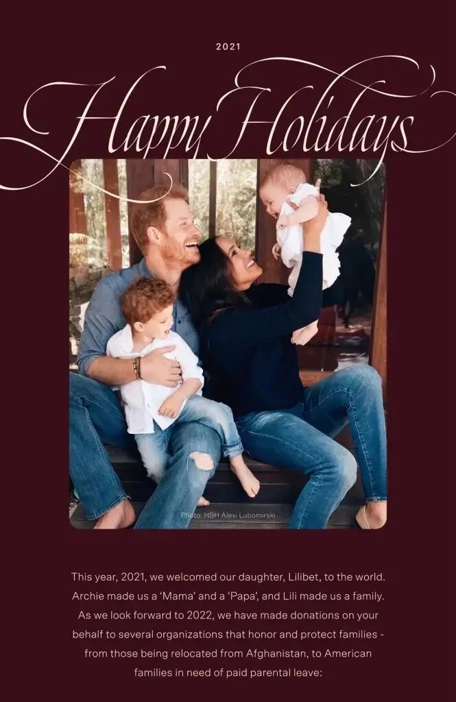 Na fotografijama je cela porodica, što je samo po sebi retkost kada je reč o njihovim javnim pojavljivanjima. Supružnici sa decom snimljeni su na drvenom mostu na otvorenom, najverovatnije u blizini njihovog doma u Montecitu, a celokupna kompozicija zasnovana je na nežnim nijansama bele i plave boje. Megan je u jednostavnoj beloj haljini bez rukava i crnim cipelama sa špicastim vrhom. Hari i Arči nose farmerke, dok je Lilibet u nežno plavoj slojevitoj haljini, belim dokolenkama i srebrnim cipelama, što dodatno pojačava osećaj smirenosti i porodične harmonije.