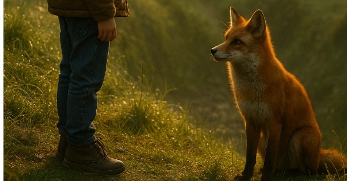 Jednog dana čuo je šuštanje. Iza žbuna se pojavila lisica — riđa, tanka, s pažljivim očima.
