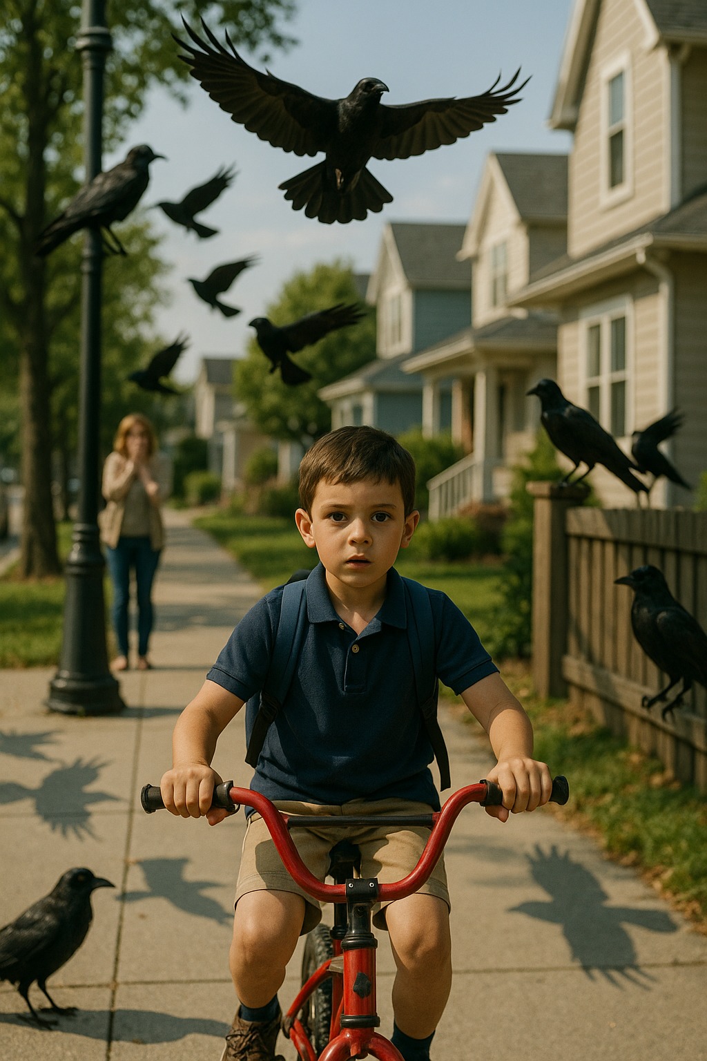 Niko u komšiluku nije mogao da objasni tu pojavu. Dečak nikada nije obraćao pažnju na njih, nije ih terao. Samo bi vozio dalje, mirnog izraza lica, kao da je sasvim normalno da ga prati oblak tamnih krila.