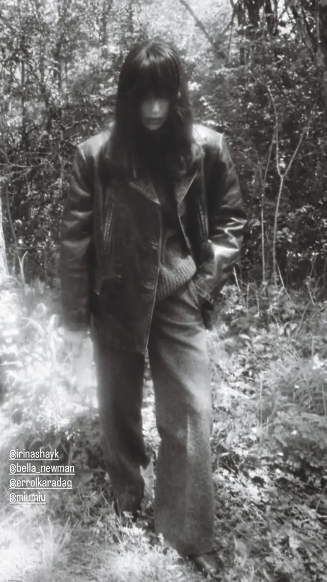 Na drugoj fotografiji Šajk menja raspoloženje potpuno: ravna šiška prekriva deo lica, a crno-beli stil dodaje filmski efekat. Kožna jakna, farmerke, džemper — minimalizam pretvoren u čistu modu.