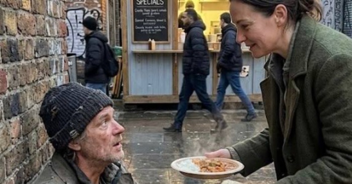 Čovek je mirno stajao pored male tezge sa hranom, njegov pas se priljubio uz njegove noge, pokušavajući da se malo ugreje. Nisu molili. Nisu tražili pomoć. Samo su stajali tamo, kao da se nadaju da će ih svet primetiti bez da moraju da kažu i reč.