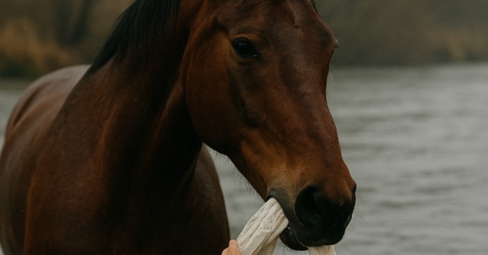 A pored nje — konj. Velik, dorat, s mokrom grivom, kao da je iskočio iz sna.
