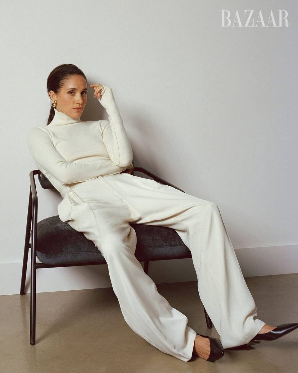 Naslovna strana urađena je u minimalističkom duhu: Megan pozira u Dior sakou na golo telo i ravnim pantalonama. Kosa joj je podignuta u laganu, namerno neurednu frizuru, a jedini nakit su minđuše Tiffany & Co. Na drugoj fotografiji, vojvotkinja sedi u fotelji, u elegantnoj Ferragamo haljini na jedno rame — izgled deluje mekše i opuštenije.