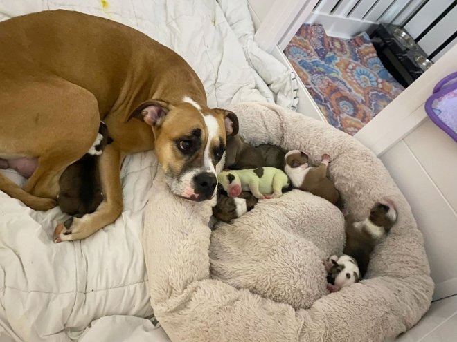 Kanadski buldog Freja okotila je osam štenaca — ali jedno od njih rođeno je sa retkim zelenim krznom.