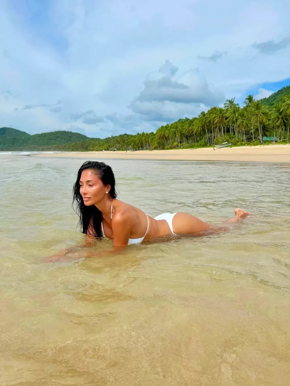 U jednoj od poslednjih objava, Nikol se pojavila na obali mora u belom bikiniju na pertle, koji naglašava njen zlatni ten i besprekoran izgled.