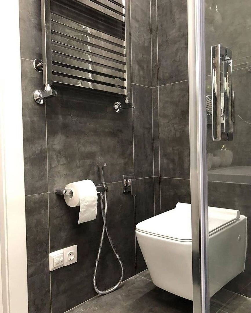 Kupatilo prati koncept celog stana — krupne betonske pločice, minimum detalja, blaga industrijska estetika. Prefinjen minimalizam nam je bliži od dekoracija poput školjki i delfina.