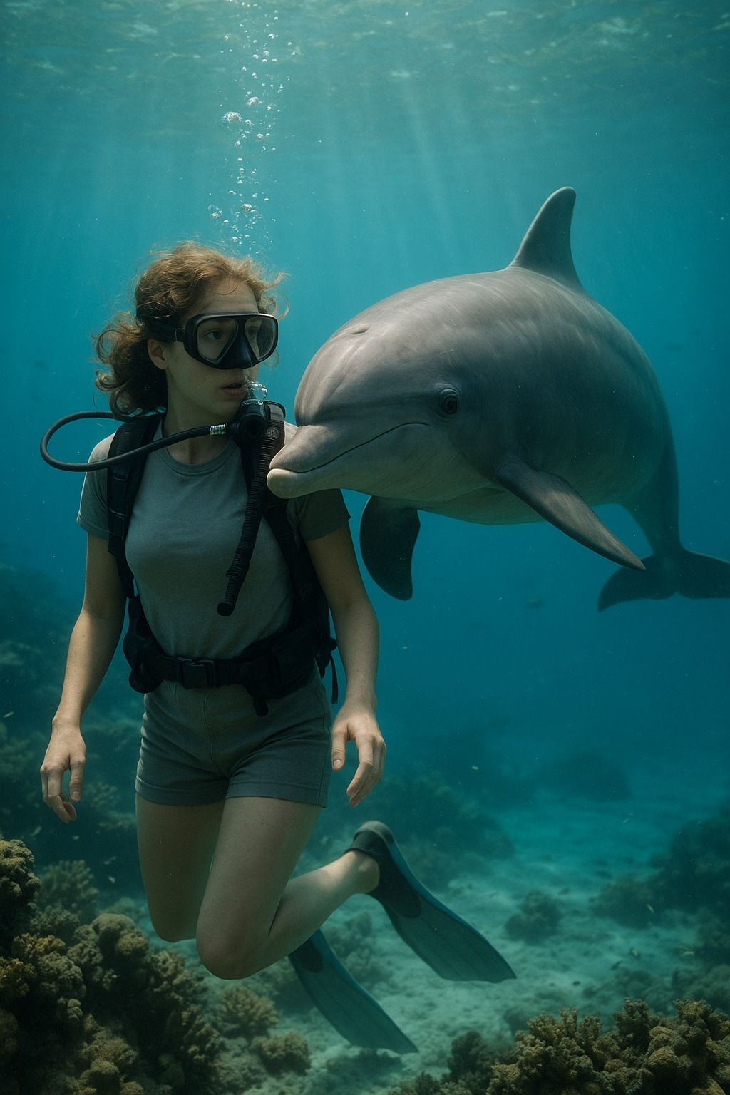 Posle nekoliko minuta primetila je da se ponaša čudno — previše uporno. Gurao ju je bokom, kao da želi da je odvoji od grebena. U početku je mislila da se igra, ali je zatim osetila nemir. Delfin je iznenada zaronio ispred nje, presekao joj put.