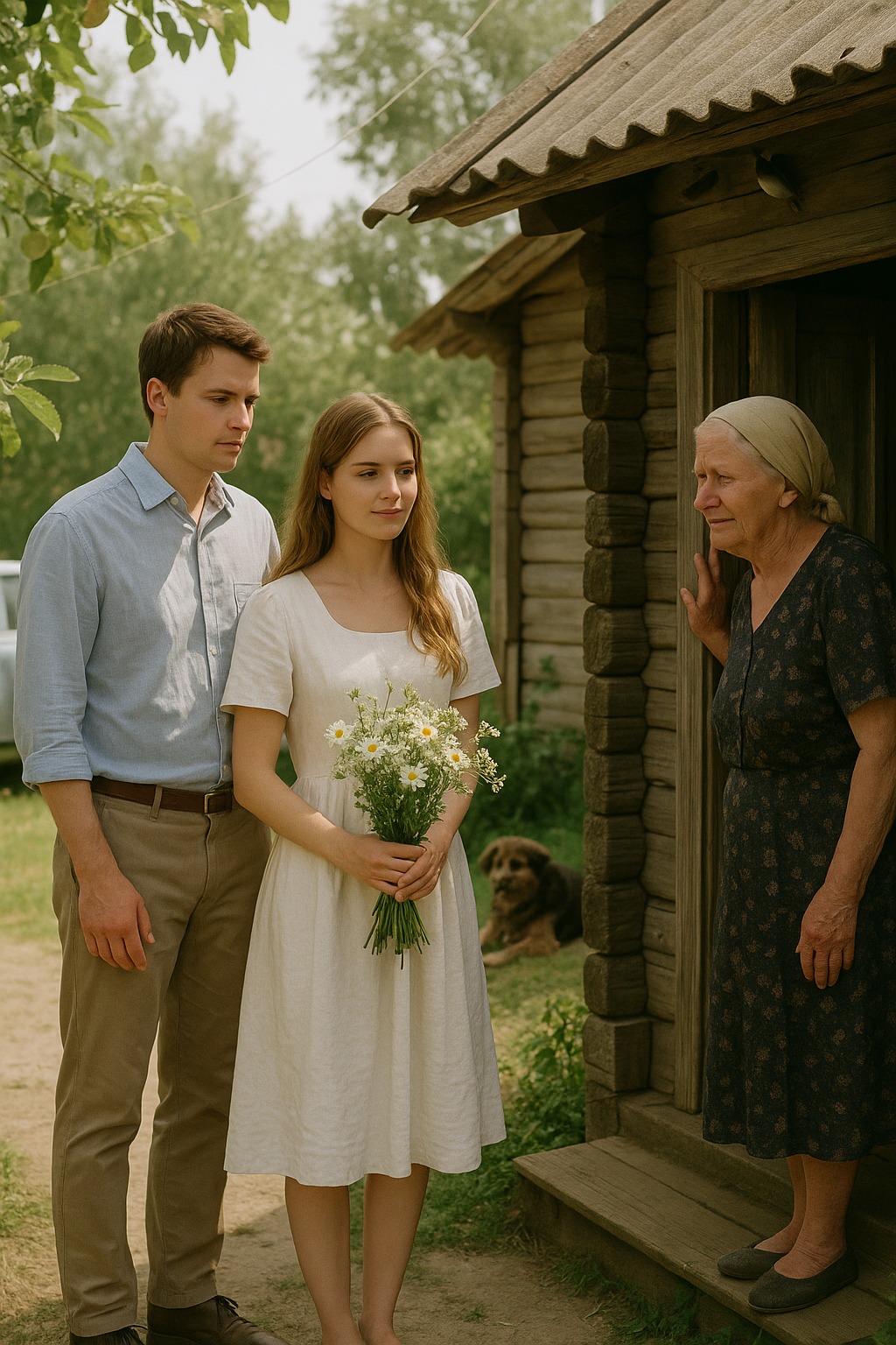 Prvi je izašao mladić — visok, u svetloj košulji, pomalo stidljiv. Za njim — devojka, vitka, svetlokosa, s buketom poljskih belih rada u rukama. Pogledala je oko sebe, kao da pokušava da se seti da li je već bila ovde. U vazduhu je mirisalo na jabuku i topao prah, negde iza šupe lajao je pas.