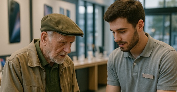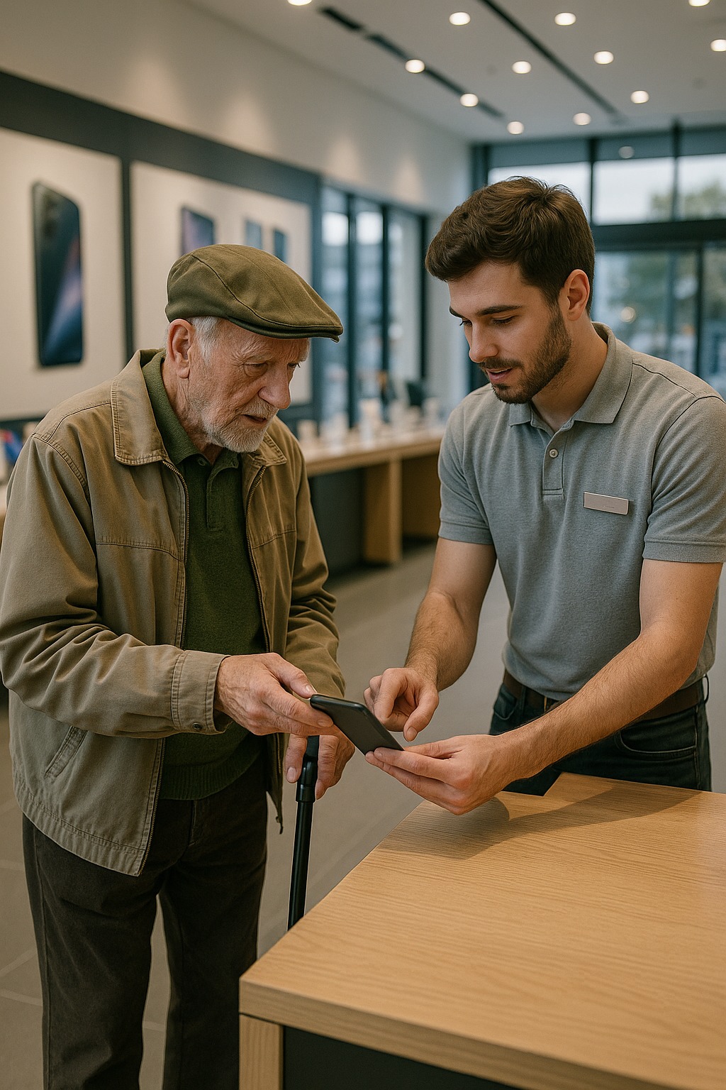 Kad je ušao, u prostoriji je mirisalo na plastiku, kafu i novu tehniku. Iza pulta je sedeo mladi prodavac sa slušalicom u uhu — onaj tip ljudi koji prelaze s kupca na kupca kao s pesme na pesmu. Kad je video starca, odložio je tablet i ljubazno se nasmejao: