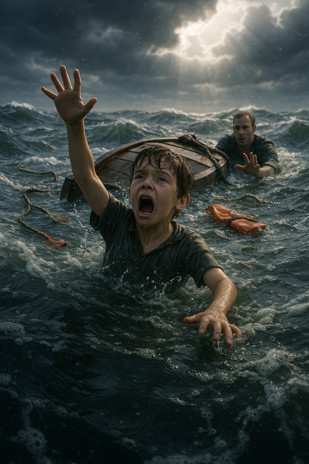 Posle nekoliko minuta nebo se iznenada promenilo. Udar vetra, talas, snažan trzaj — i čamac se prevrnuo. Otac se uhvatio za ivicu, ali je dečak nestao pod vodom. Voda mutna, hladna, panika je gušila dah.