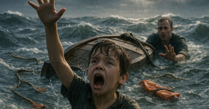 Posle nekoliko minuta nebo se iznenada promenilo. Udar vetra, talas, snažan trzaj — i čamac se prevrnuo. Otac se uhvatio za ivicu, ali je dečak nestao pod vodom. Voda mutna, hladna, panika je gušila dah.