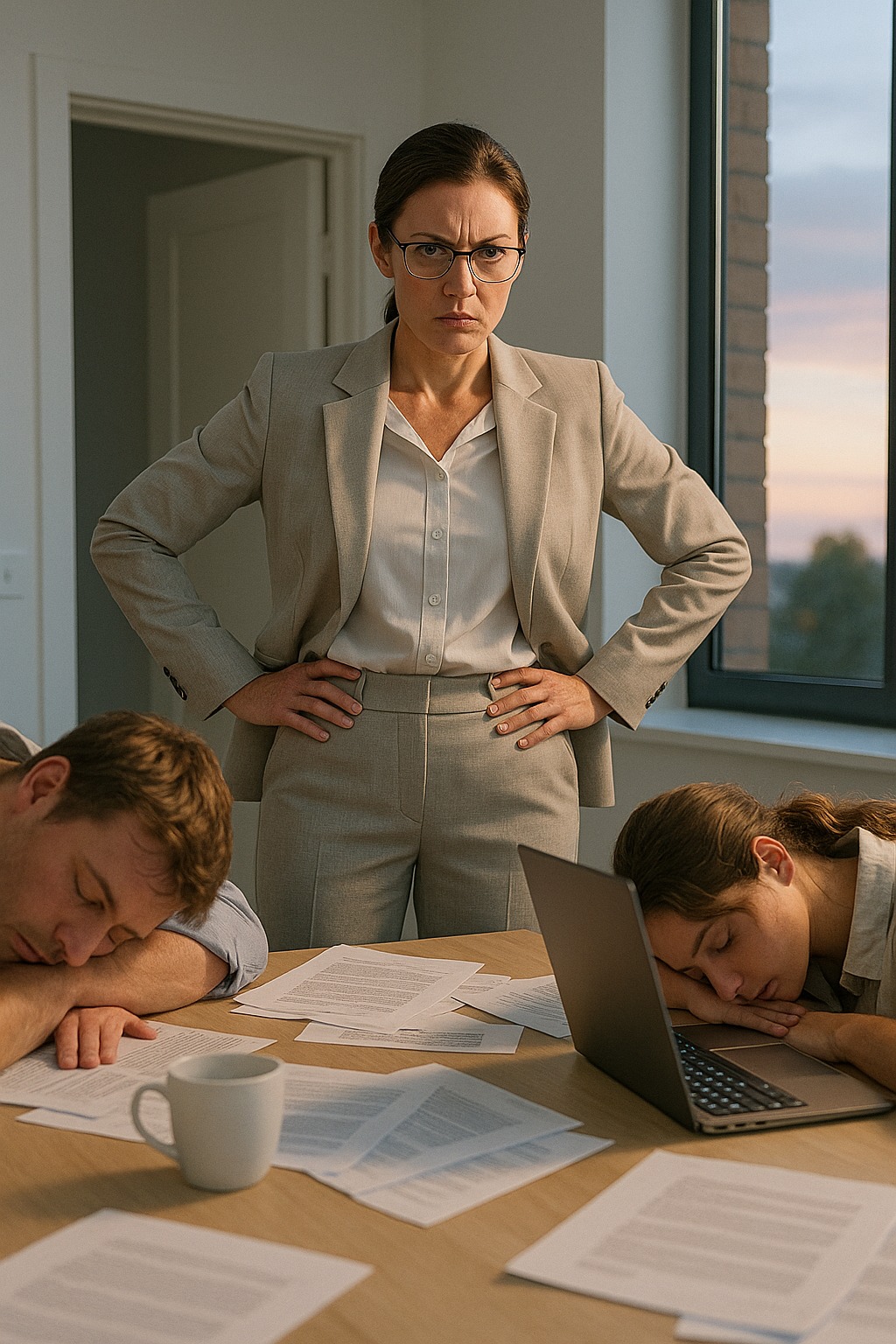 Na dugačkom stolu, među laptopovima i razbacanim papirima, spavala su dvoje. Džejd, njena asistentkinja, naslonjena na fasciklu, i Nik, mladi analitičar, pored nje, u polusnu. Između njih — prazne šolje, mrvice, zabeleške. Na ekranu prezentacija, nedovršen slajd, ali skoro gotov.