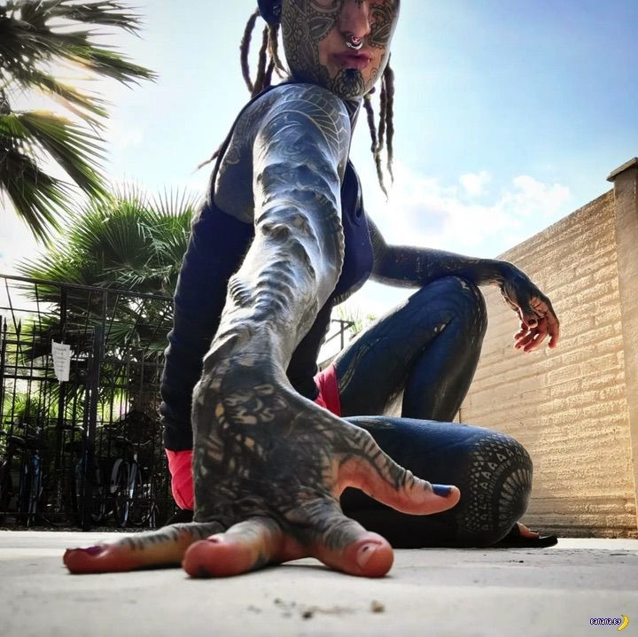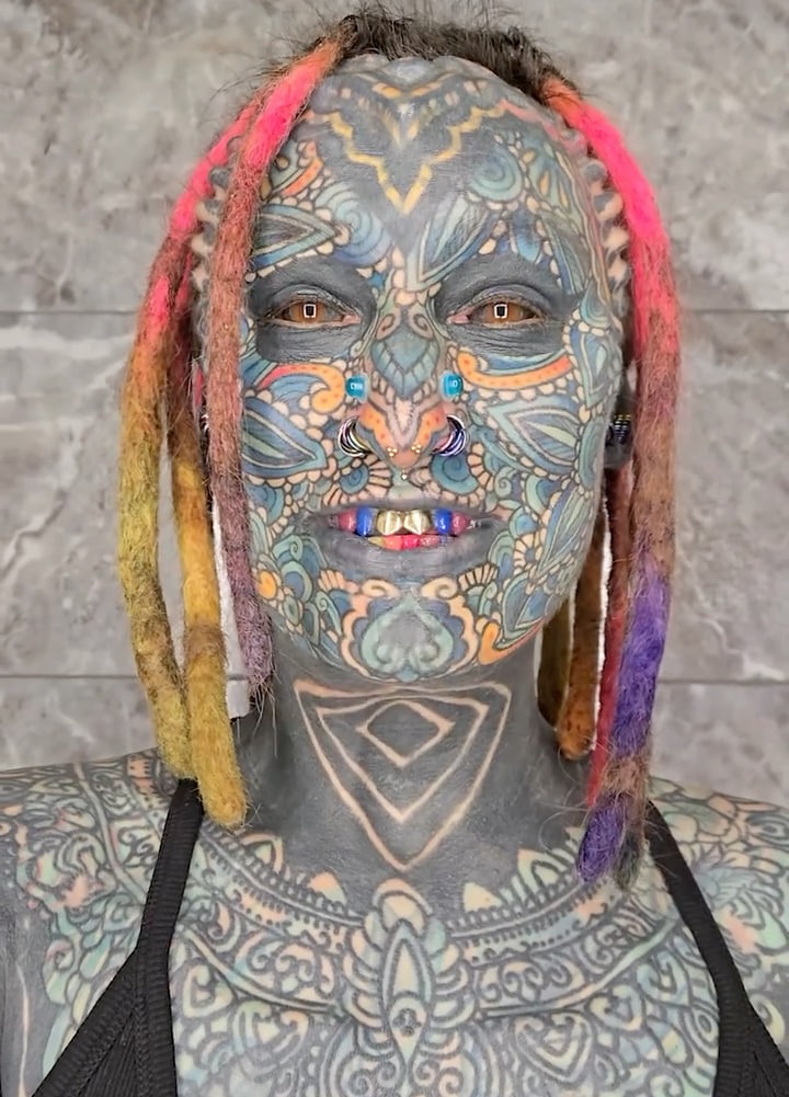 Služila je u vojsci, a sada je upisana u Ginisovu knjigu rekorda. 💉 Tridesetšestogodišnja Esperans Furezina prekrila je tetovažama 99,98% tela — uključujući oči, jezik i čak desni. 😱 Tokom deset godina uradila je 89 modifikacija i oborila svetski rekord, pretvorivši svoje telo u živi dnevnik sećanja.